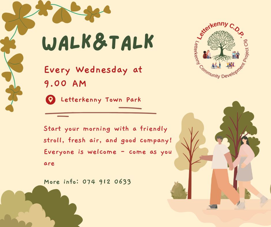 Everyone is welcome to join us in Letterkenny Town Park for a friendly Walk & Talk, every Wednesday at 9AM.